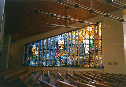La chapelle, moderne mais magnifique par sa luminosité apportée par ses très beaux vitraux colorés.